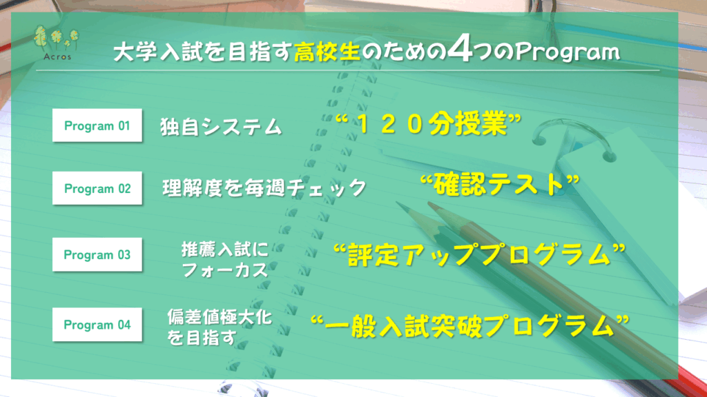 「高校生のための4つのProgram」に盛り込まれた「4つのProgram」はアクロス独自の指導法です。これから一つひとつ紹介します。