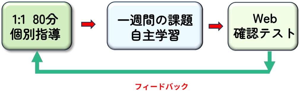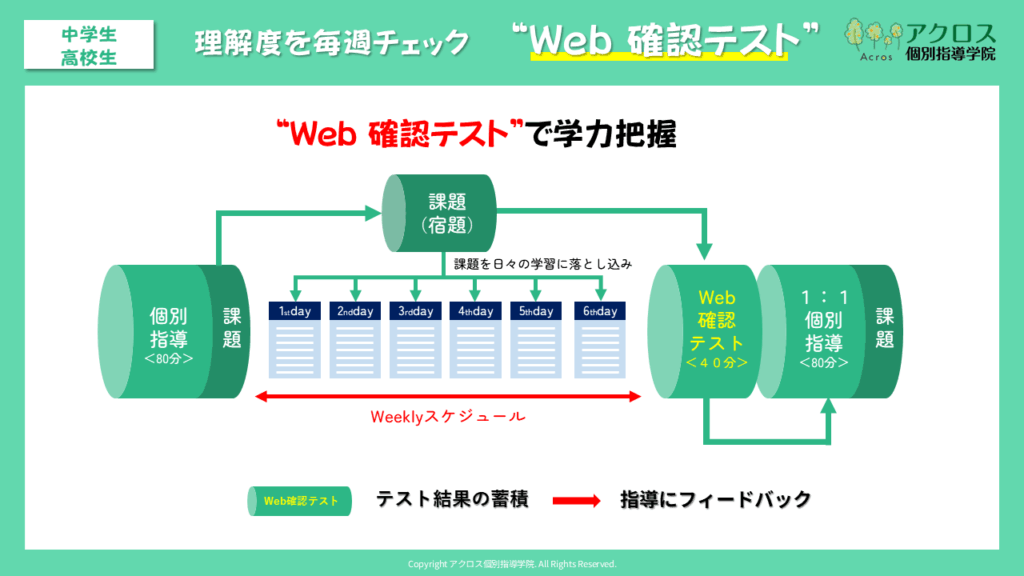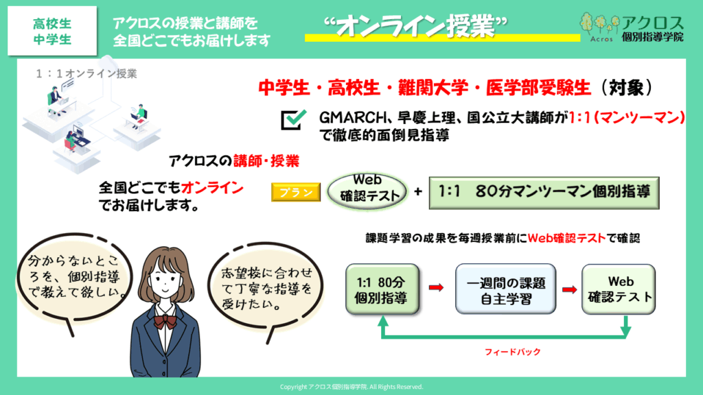 『1:1 80分個別指導+Web確認テスト』がアクロスオンライン授業システムの基本プランです。