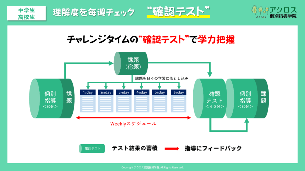 アクロスでは「確認テスト」を使って生徒の「やる気」を養成しています。