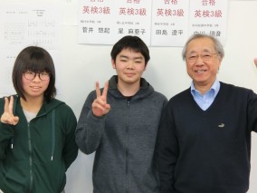 星さんも宮崎君も難関を突破しての第一志望に合格です。おめでとうございます。星さんは人気の高島高校、宮崎君は男子の倍率が二倍を超えた三田高校に合格です。進学したら星さんはブラスバンド部、宮崎君は弓道部に入部の予定だそうです。それぞれの高校時代力一杯駆け抜けてください。また会える日を楽しみにしています。合格おめでとう!!!二人とも頑張りました。