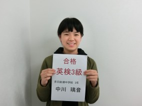 今回の英検三級も余裕の合格です。実力がついてきました。これも日頃の努力の結果ですね。中川さんこれをバネに次のステップを目指してさらなる努力を続けてください。期待しています。