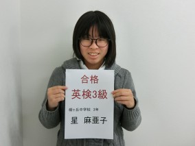 どちらかというと英語が手だった星さん。弛まぬ努力の結果英検三級合格です。おめでとうございます。これからも努力を続けてください。