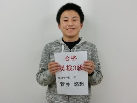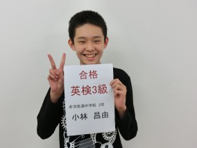 小林君おめでとうございます!!!見事英検3級合格です。2年生のこの時点で英検3級合格は立派です。日頃の学習の成果が出ました。これからも頑張ってください。
